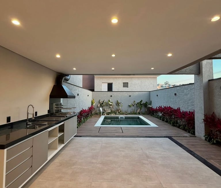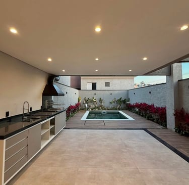 Espaço gourmet coberto: Com iluminação embutida e estrutura moderna, é o lugar ideal para churrascos, jantares ao ar livre e encontros memoráveis com quem você ama.